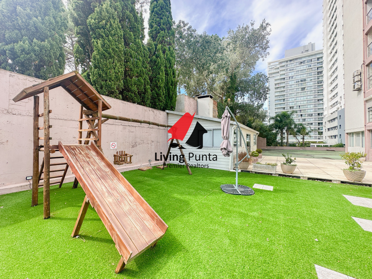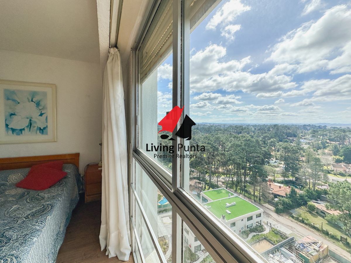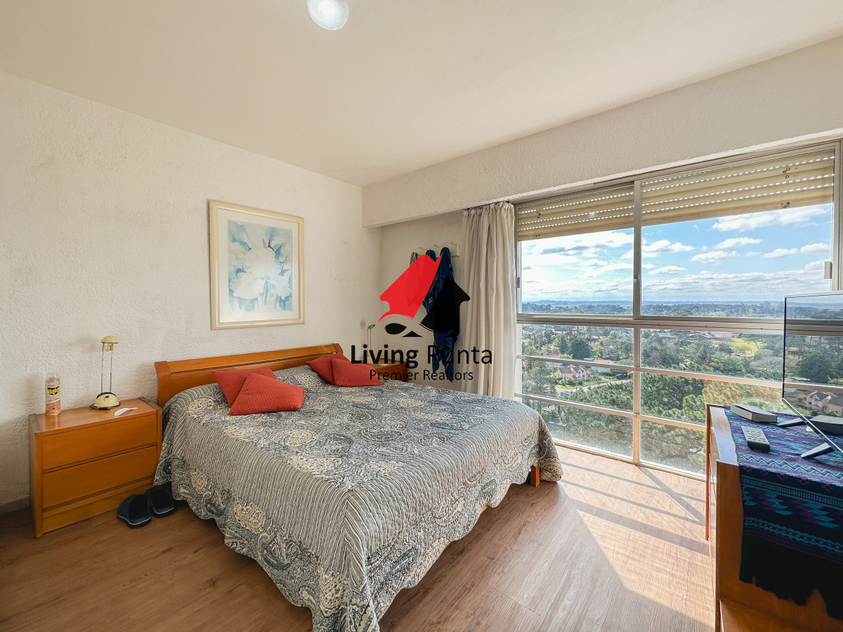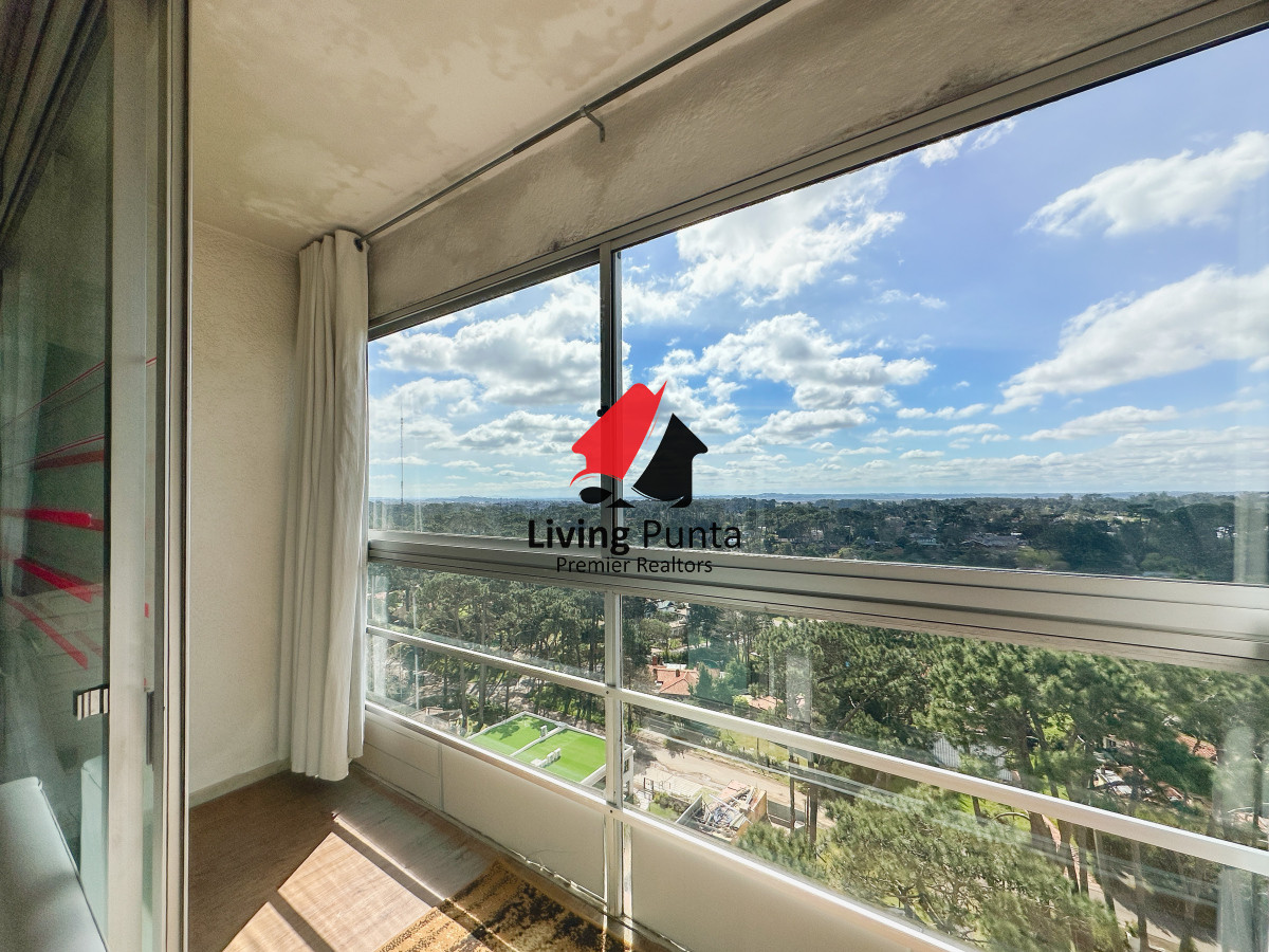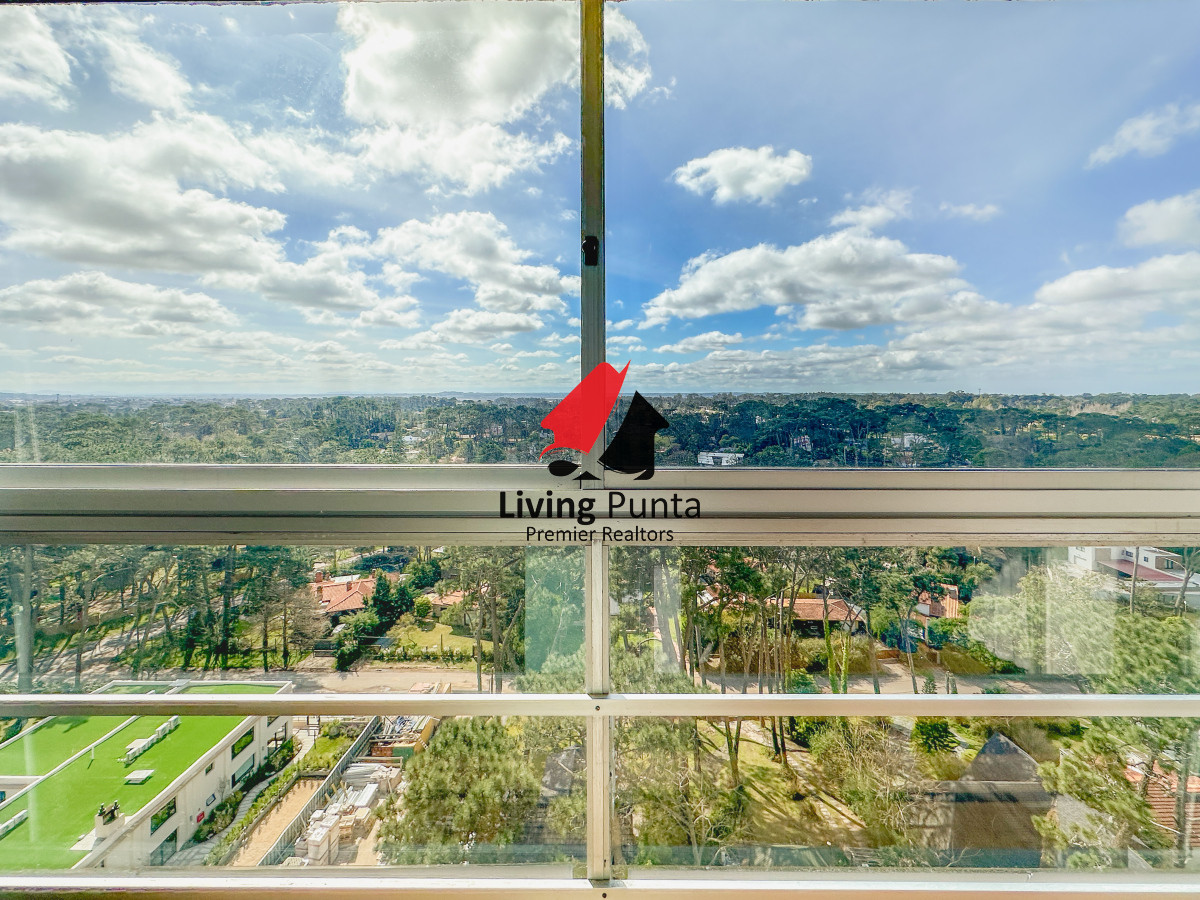 Apartamento en piso alto a pasitos de Sanatorio Cantegril y universidad Claeh. Impactantes vistas a los bosques y lateral al mar, excelente orientación solar. Amplio living-comedor con balcón cerrado, cocina definida con lavadero y acceso de servicio. 2 dormitorios (principal en suite), 2 baños completos. Garage en subsuelo. Edificio con recepción 24hs, SUM, barbacoa, playground y gym.