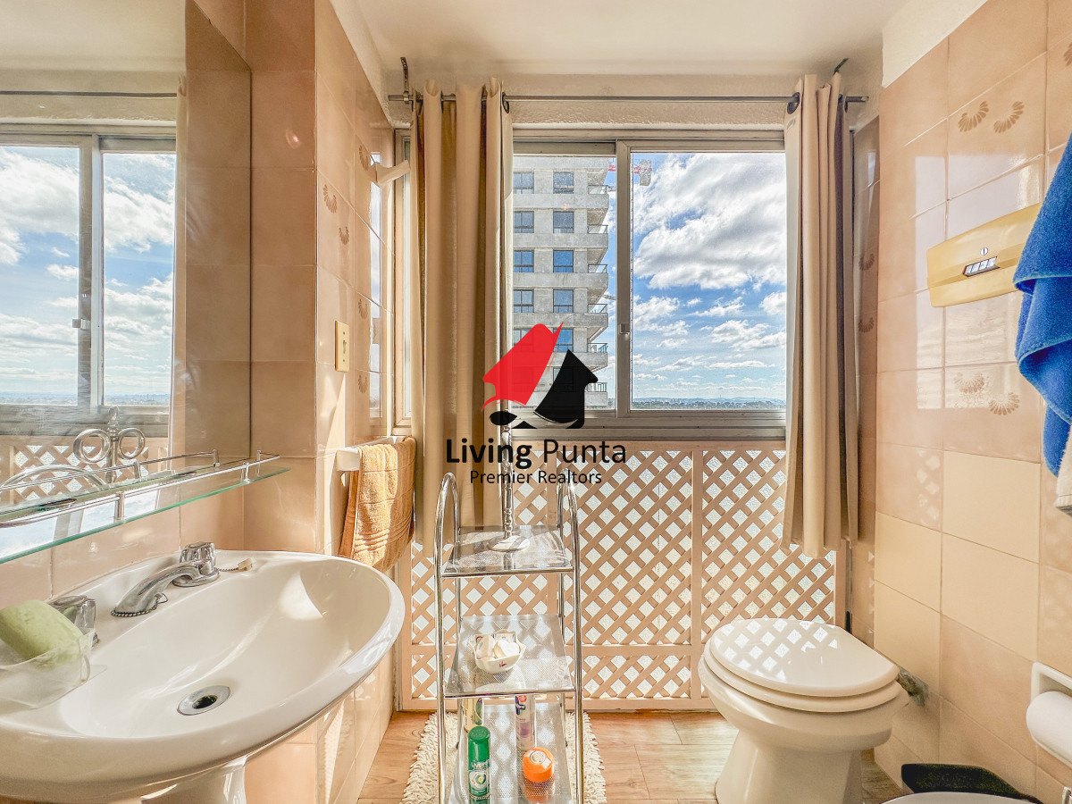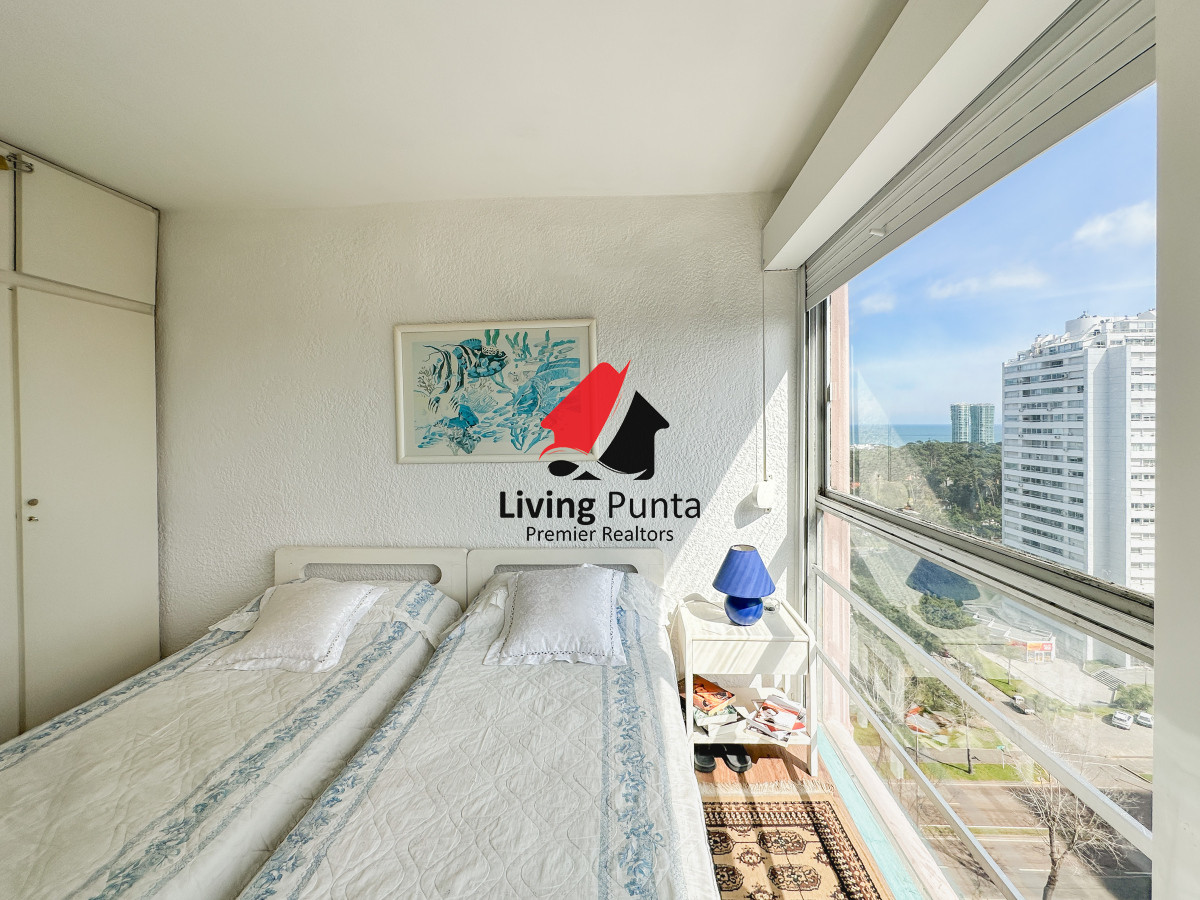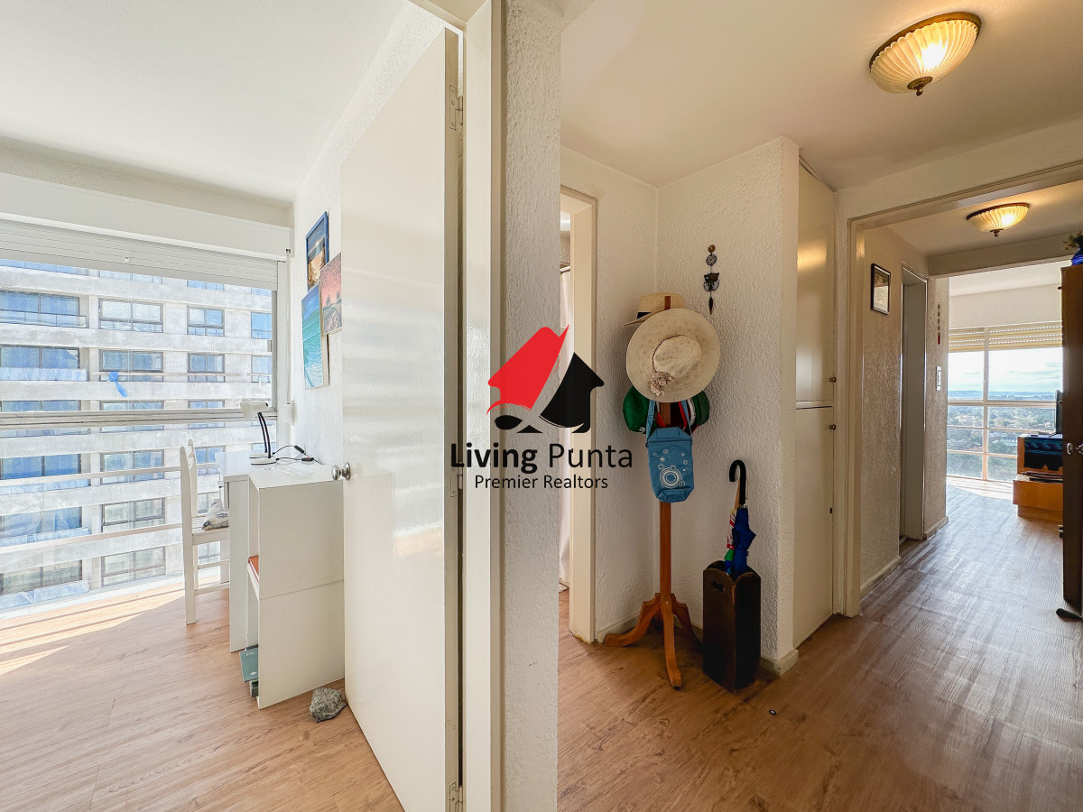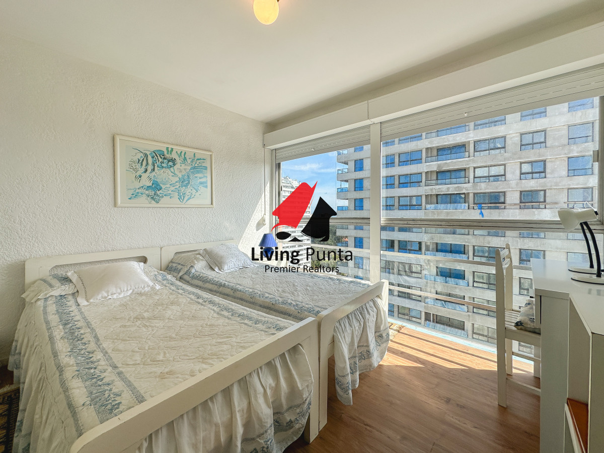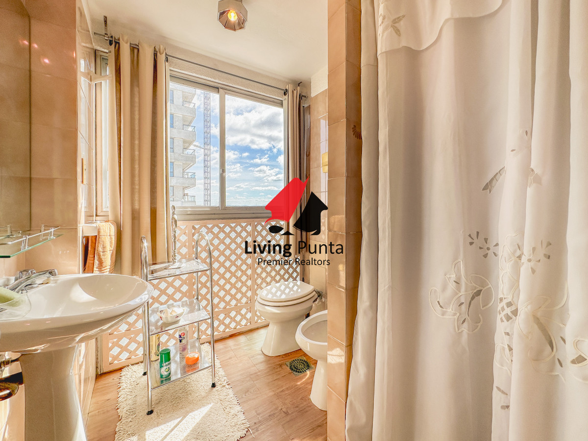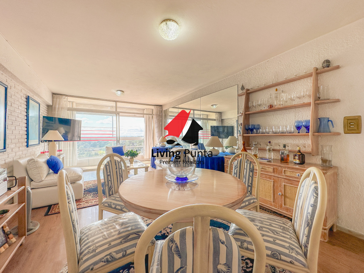 Apartamento en piso alto a pasitos de Sanatorio Cantegril y universidad Claeh. Impactantes vistas a los bosques y lateral al mar, excelente orientación solar. Amplio living-comedor con balcón cerrado, cocina definida con lavadero y acceso de servicio. 2 dormitorios (principal en suite), 2 baños completos. Garage en subsuelo. Edificio con recepción 24hs, SUM, barbacoa, playground y gym.