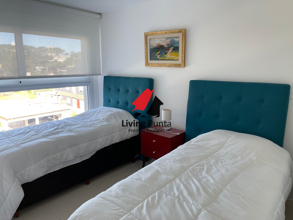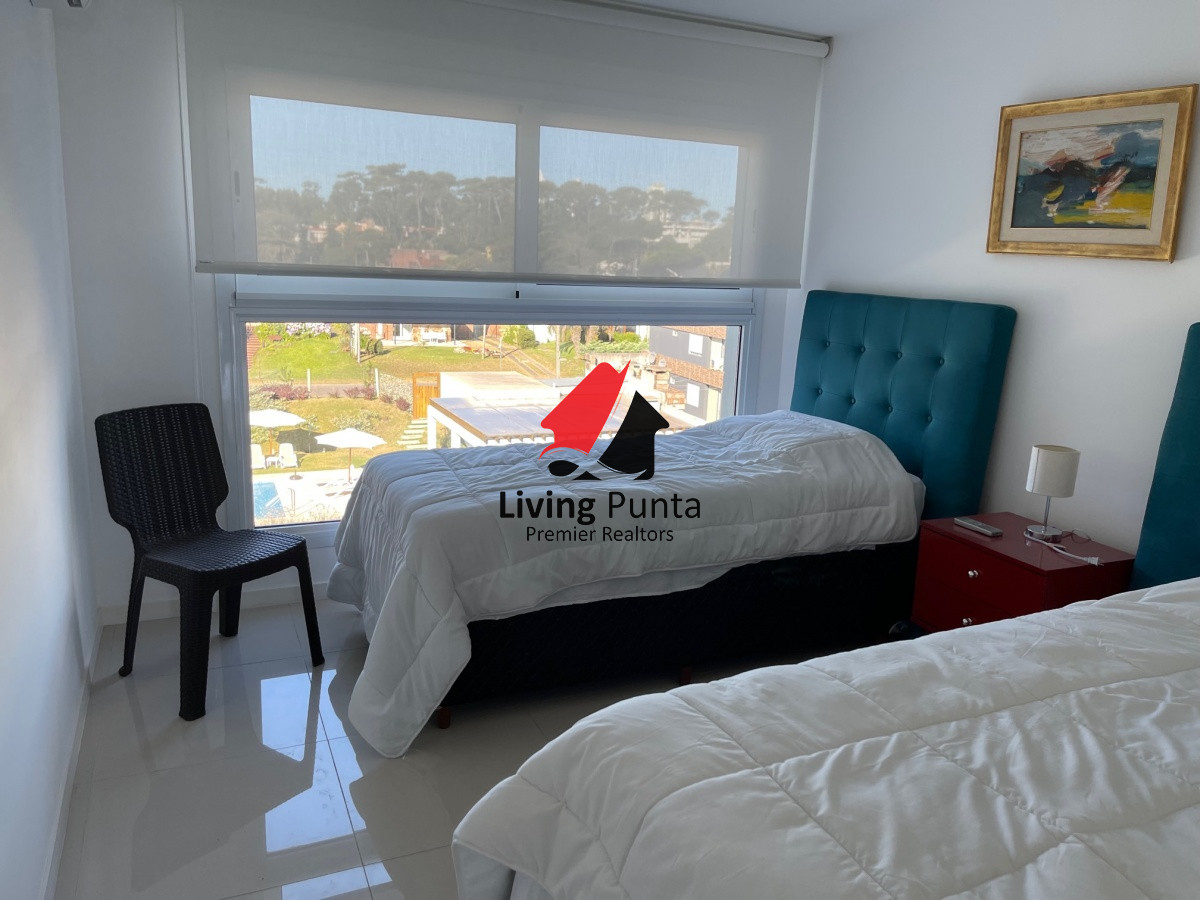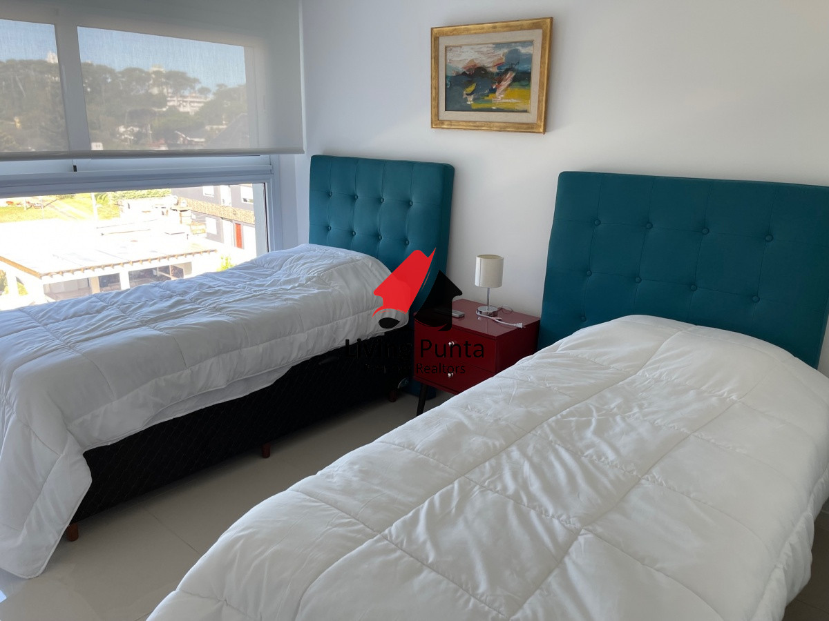 2 dormitorios en suite, principal al frente, el 2do con vista a la piscina del edificio y jardines.