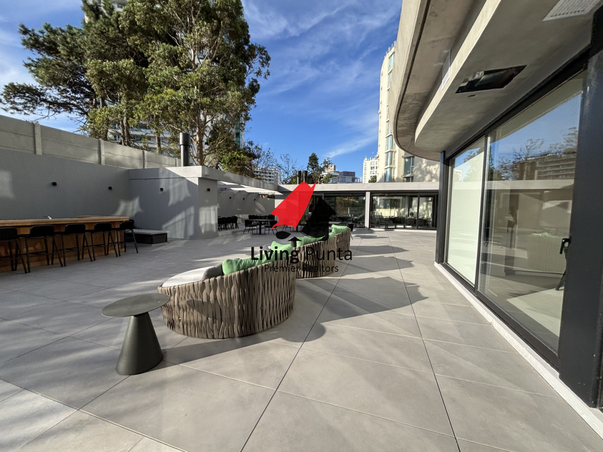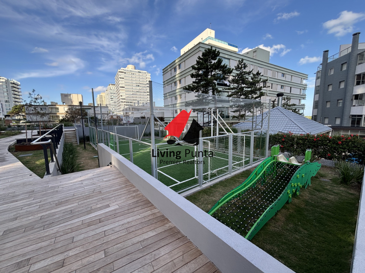 Torre de fino diseño con 18 pisos y amenities de primera categoría dentro de los cuales destacamos: piscina exterior para adultos y niños, pool bar, barbacoas de uso común, cancha de usos múltiples, microcine, zona cowork, sala de juegos, amplios jardines de uso común con finos detalles de paisajismo, piscina interior climatizada en piso 18 en doble altura con vistas a Playa Mansa, spa y gimnasio con vista al mar en piso 18. Lobby de gran tamaño con visuales directas al jardín selvático interior.