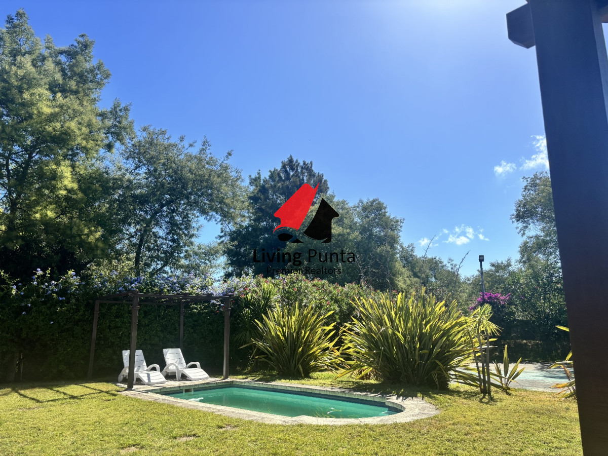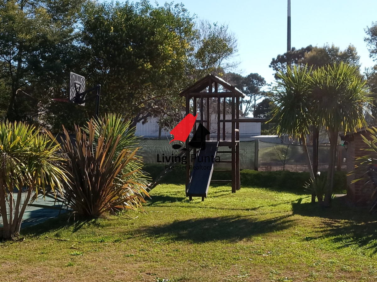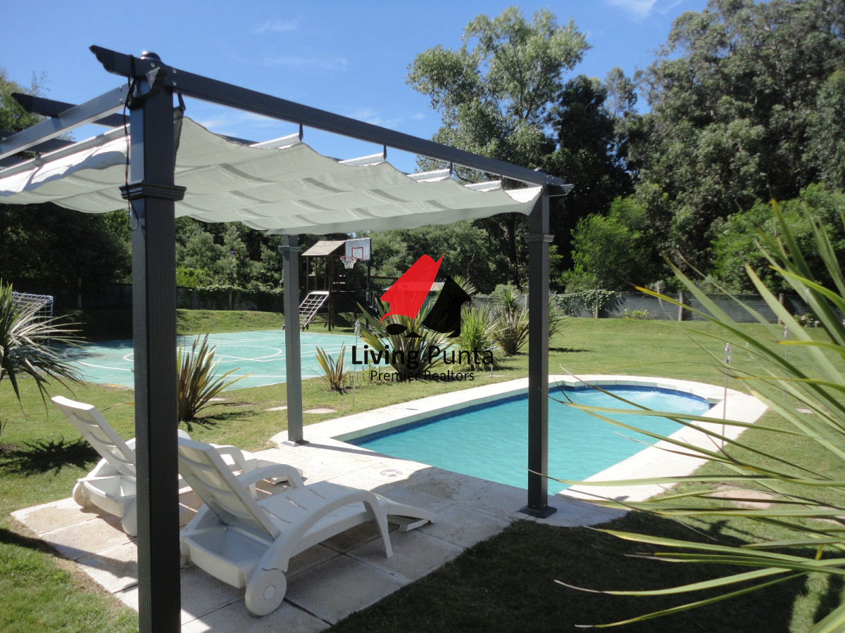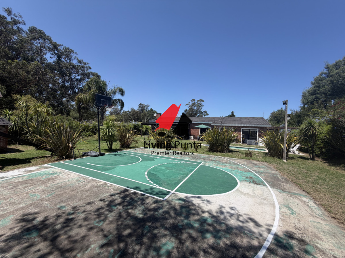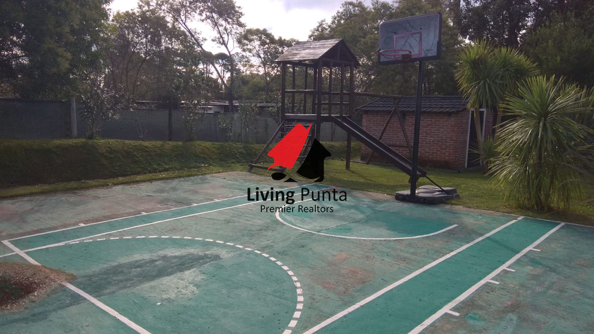 El exterior nos conecta con una hermosa galería, piscina climatizada, jardín totalmente parquizado, riego automatizado, cancha de uso múltiple, área de juegos exteriores para niños, cámaras de vigilancia, cerco perimetral y cochera exterior.