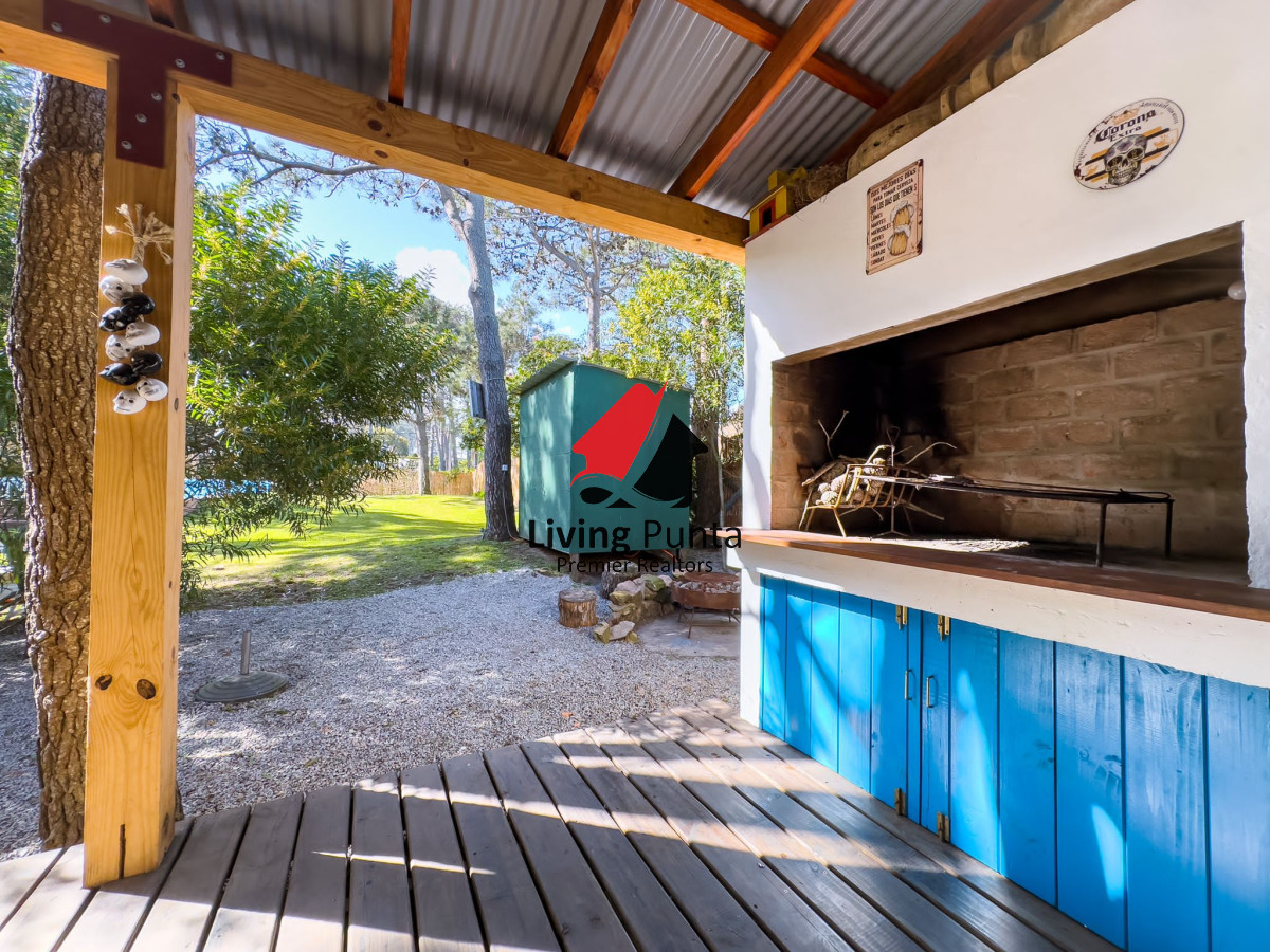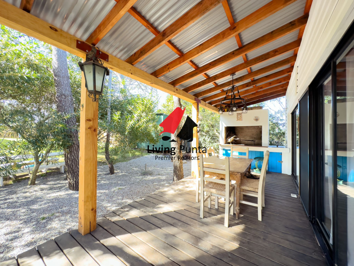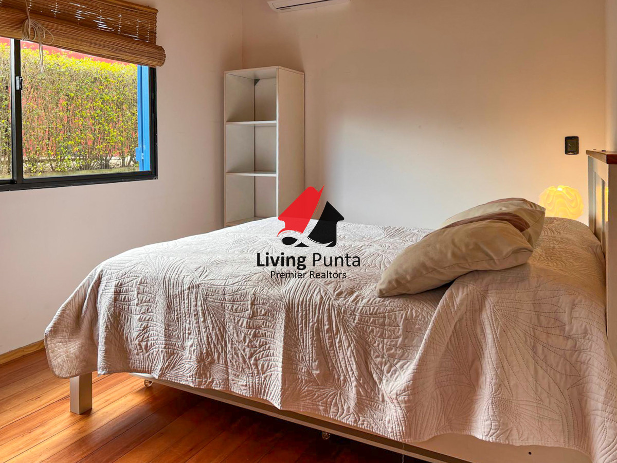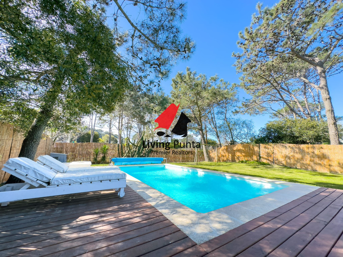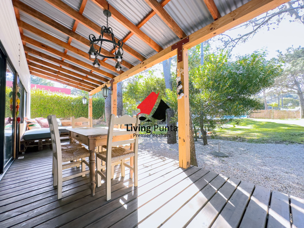 Amplio living comedor con cocina integrada , 3 dormitorios (3 camas de dos plazas + 1 de una plaza), 2 baños completos (principal en suite), amplio deck con parrillero, jardin cercado de 850 metros cuadrados, piscina.