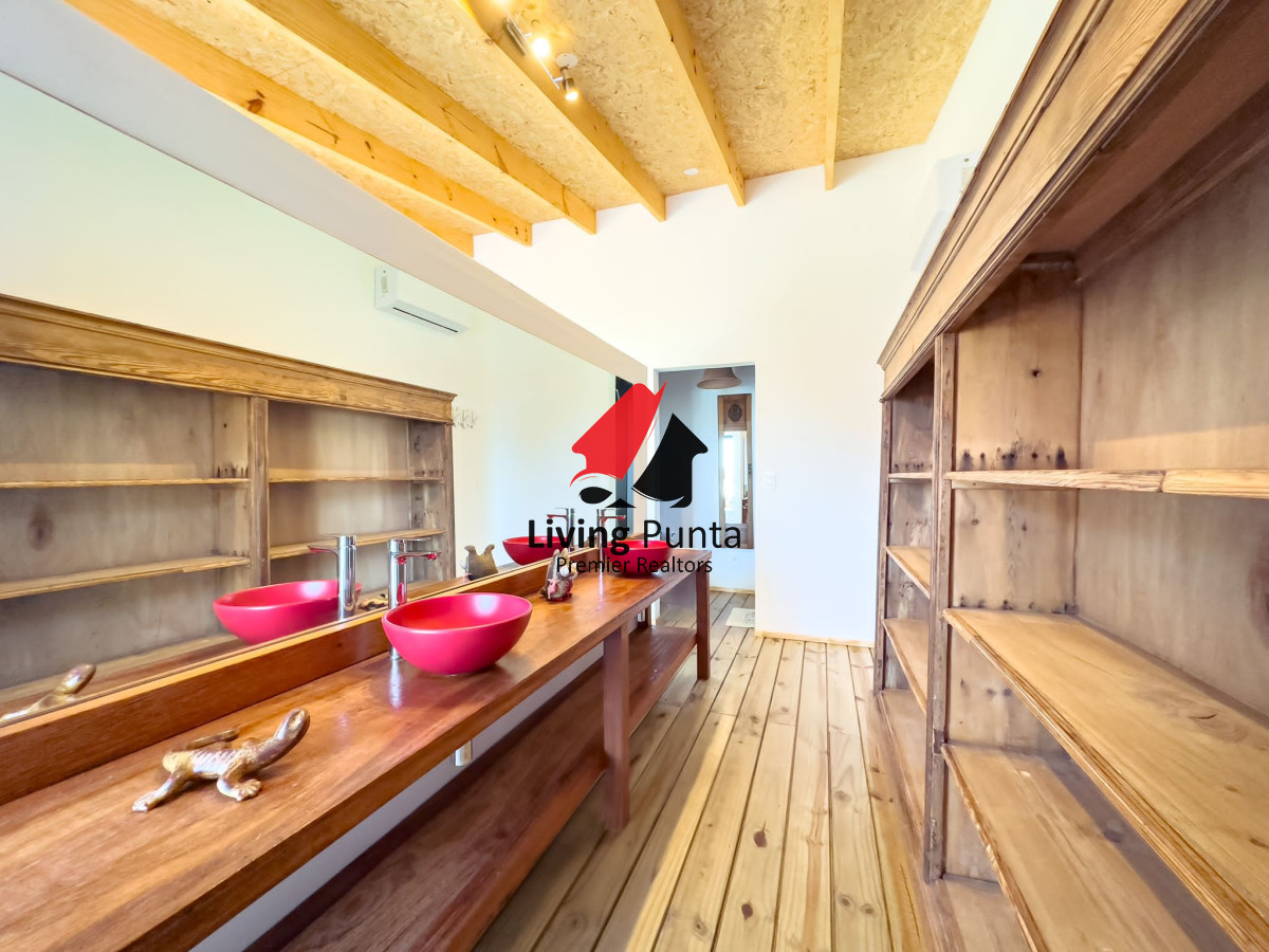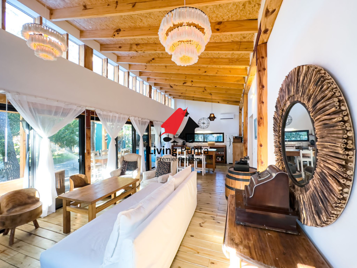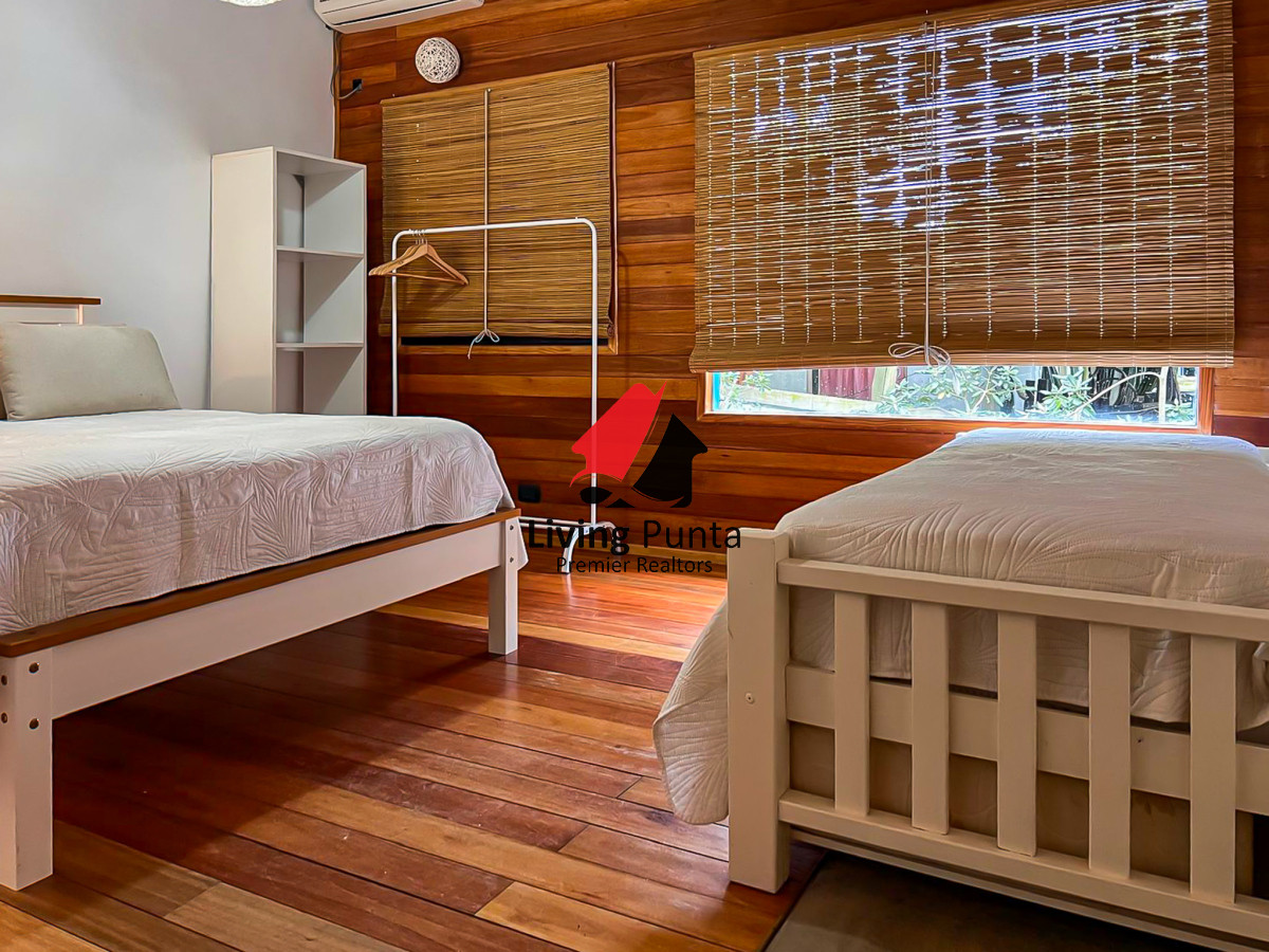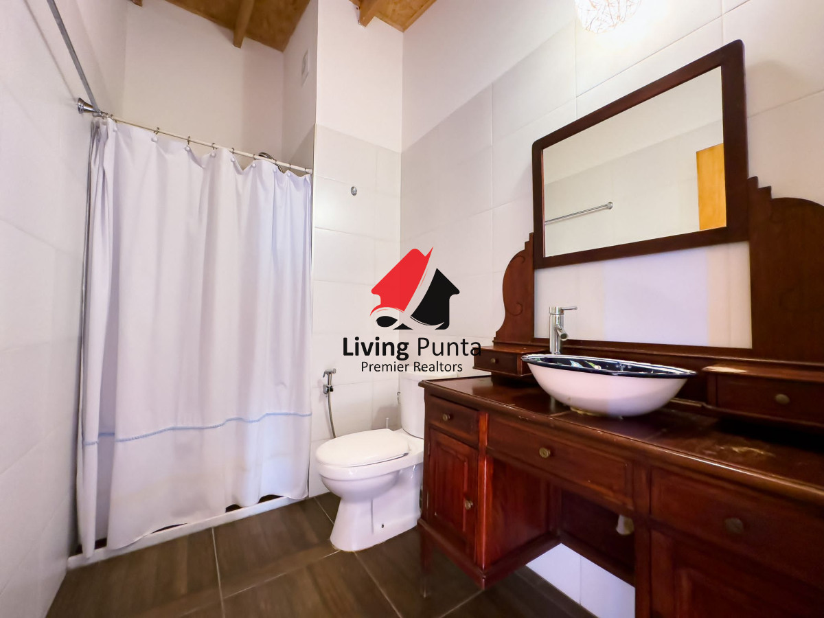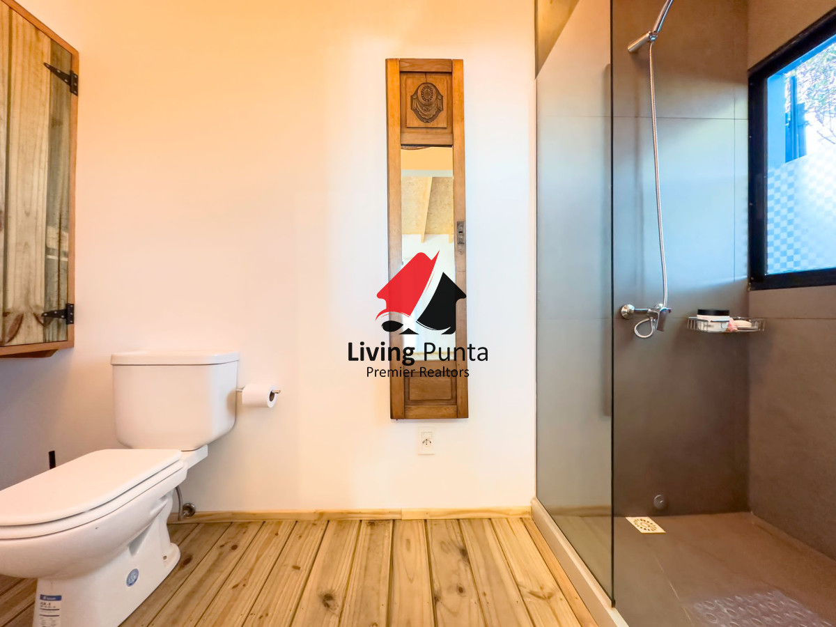 Amplio living comedor con cocina integrada , 3 dormitorios (3 camas de dos plazas + 1 de una plaza), 2 baños completos (principal en suite), amplio deck con parrillero, jardin cercado de 850 metros cuadrados, piscina.